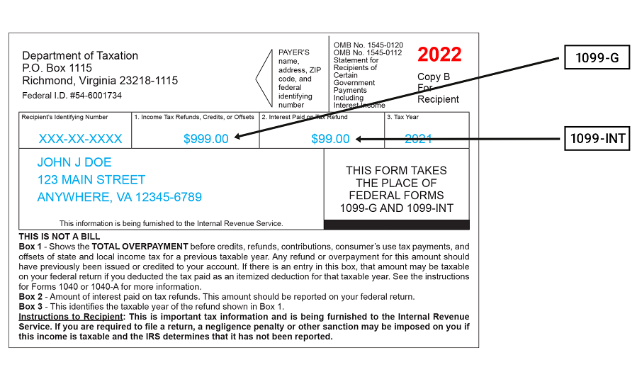 يعكس النموذج 1099-G الخاص بك أي رصيد مسترد أو رصيد مدفوعات زائدة تلقيته منا العام الماضي (الخانة 1)، وأي فائدة مقابلة (الخانة 2). في هذا العام، سيتضمن أيضًا مبلغ الخصم الضريبي لمرة واحدة (إذا كنت قد تلقيت خصمًا ضريبيًا منا، والخصومات المفصلة في العام الماضي). إذا قمت بتفصيل الاستقطاعات في العام الماضي، فقد تحتاج إلى الإبلاغ عن هذه المبالغ كدخل في إقرار ضريبة الدخل الفيدرالي الخاص بك.